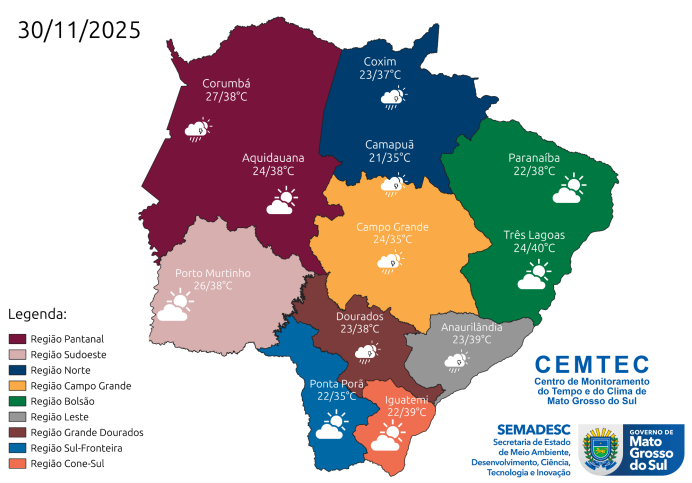 Com calor intenso neste domingo (30), a previsão do Cemtec (Centro de Monitoramento do Tempo e do Clima) indica tempo firme na maior parte de Mato Grosso do Sul. As altas temperaturas tomam conta, podendo atingir 39°C a 40°C.