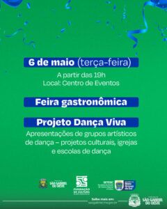 Realização: Paróquia São Gabriel | Apoio: Governo do Estado e Fundação de Cultura - 06 de maio (terça-feira) – Projeto Dança Viva