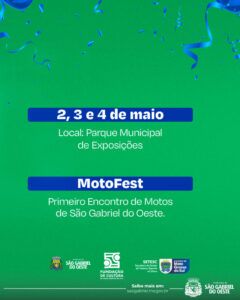 O município de São Gabriel do Oeste inicia as comemorações pelos seus 45 anos de emancipação político-administrativa com uma ampla programação que se estenderá por todo o mês de maio. As celebrações têm início no dia 2 de maio, com o Motoeste – Primeiro Encontro de Motos de São Gabriel do Oeste, e seguem com uma série de atividades culturais, esportivas, religiosas e institucionais voltadas à valorização da história, da identidade local e ao fortalecimento da integração com a comunidade.