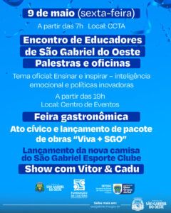 Entre os destaques da programação está o Ato Cívico em homenagem ao aniversário da cidade, que será realizado no dia 9 de maio. A solenidade marca a abertura do fim de semana festivo e incluirá o lançamento do pacote de obras “Viva + SGO”, além de apresentações artísticas, show com a dupla Vitor e Cadu, lançamento da nova camiseta do São Gabriel Esporte Clube e uma queima de fogos silenciosa. Um momento de união, reconhecimento das conquistas e celebração dos novos passos que o município trilha rumo ao futuro.