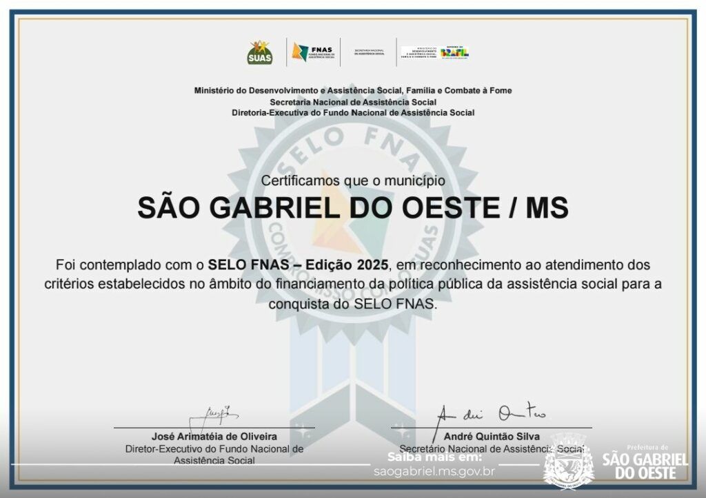 São Gabriel do Oeste conquistou o Selo FNAS 2025, certificação concedida pelo Fundo Nacional de Assistência Social (FNAS), que reconhece estados e municípios brasileiros que demonstram excelência, organização e transparência na gestão orçamentária, financeira e contábil do Sistema Único de Assistência Social (SUAS).