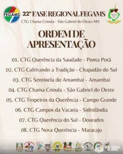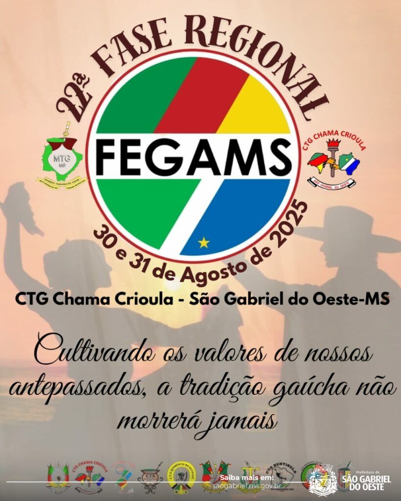 São Gabriel do Oeste será palco de mais uma grande celebração cultural: entre os dias 29 e 31 de agosto, o município recebe a 22ª Fase Regional do FEGAMS – Festival Sul-Mato-Grossense de Folclore e Tradição Gaúcha, no CTG Chama Crioula.