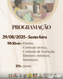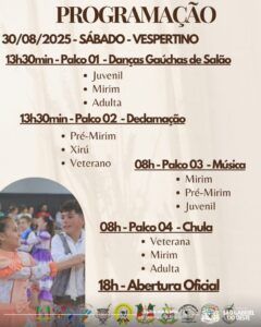 No sábado (30), a partir da manhã, começam as etapas classificatórias em diversas modalidades artísticas, como chula, declamação, interpretação musical e danças gaúchas de salão. A solenidade oficial de abertura será realizada às 18h, reunindo representantes culturais de diferentes cidades da região, marcando o início oficial das competições.