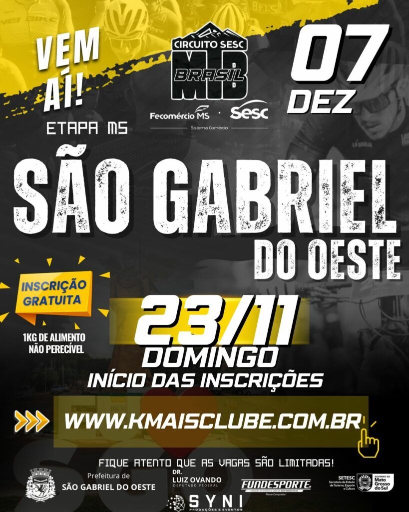 São Gabriel do Oeste será o palco, no próximo final de semana, do Circuito Sesc MTB Brasil, um dos maiores eventos voltados aos apaixonados por mountain bike. A iniciativa, realizada com apoio da Prefeitura Municipal, integra a programação oficial do Luzes do Cerrado e tem como objetivo incentivar a prática esportiva, promover a saúde e estimular o uso da bicicleta como meio de lazer e qualidade de vida.
