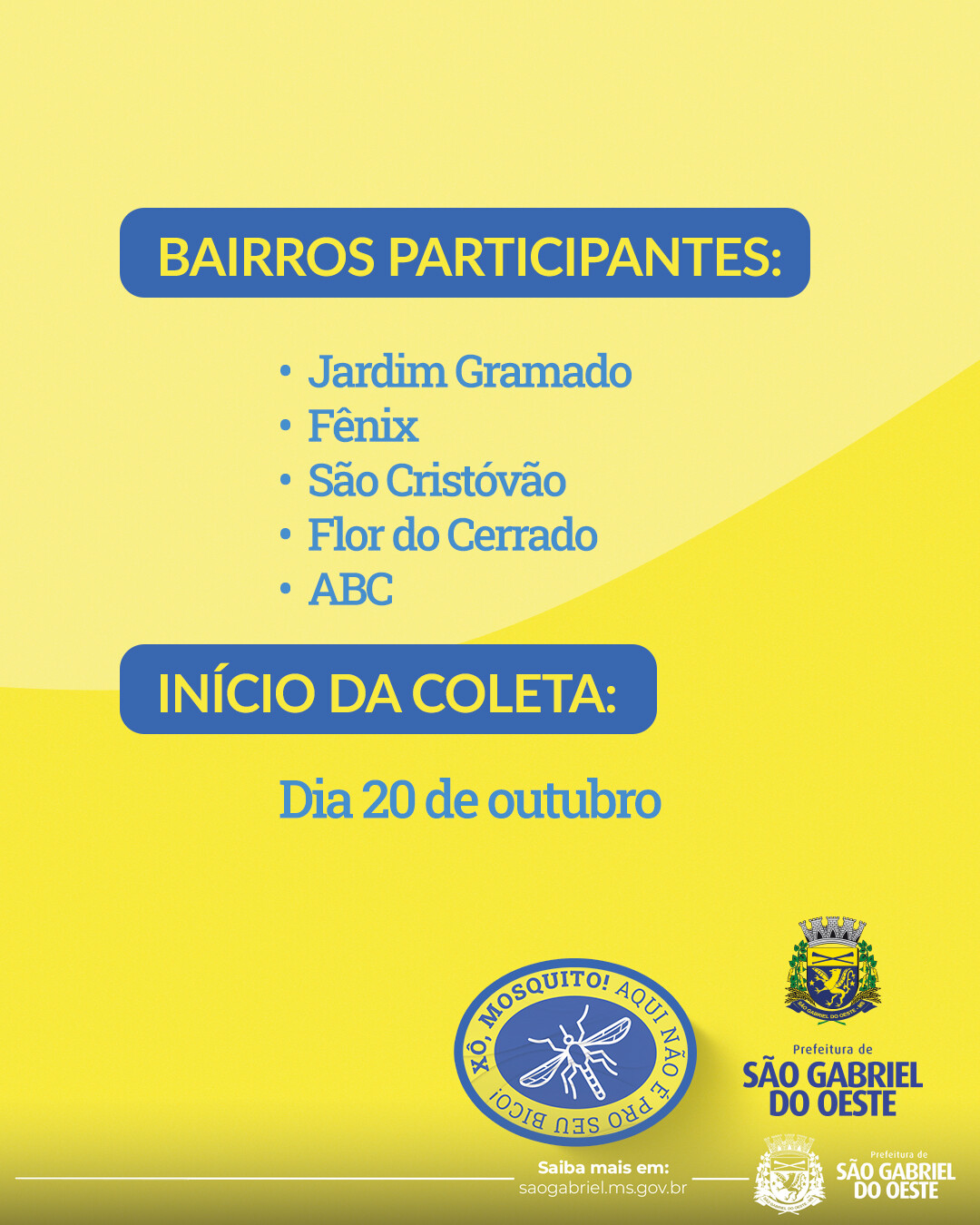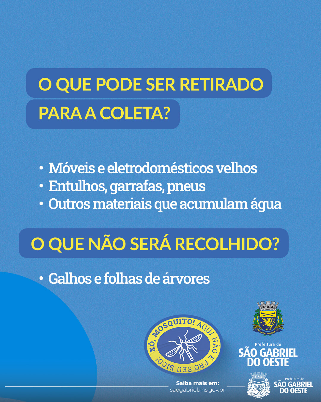A Prefeitura de São Gabriel do Oeste dará início, na próxima semana, à segunda etapa do Mutirão de Limpeza Urbana, uma ação conjunta que visa eliminar possíveis criadouros do mosquito Aedes aegypti, transmissor da dengue, zika e chikungunya. A mobilização acontecerá entre os dias 20 e 24 de outubro, abrangendo os bairros São Cristóvão, Fênix, Flor do Cerrado, ABC e Jardim Gramado.