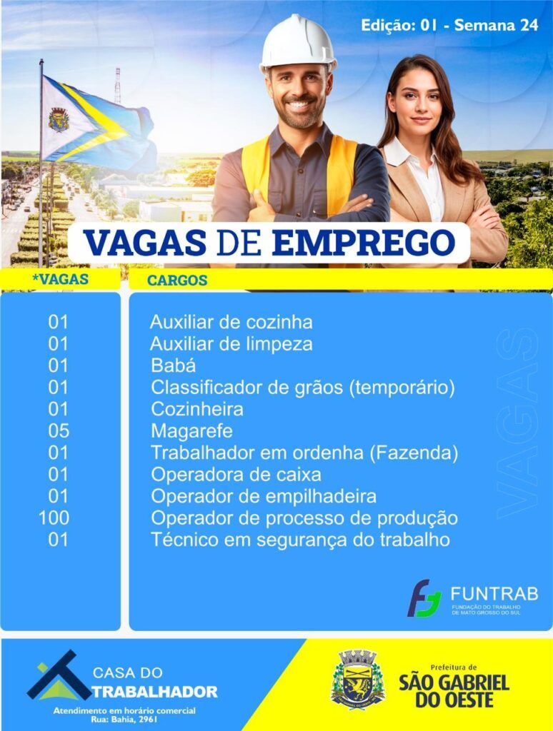 A Prefeitura Municipal de São Gabriel do Oeste, através da Casa do Trabalhador, está divulgando uma variedade de vagas de emprego. Essas oportunidades abrangem diferentes áreas e níveis de experiência, proporcionando uma série de opções para os interessados em ingressar ou retornar ao mercado de trabalho.