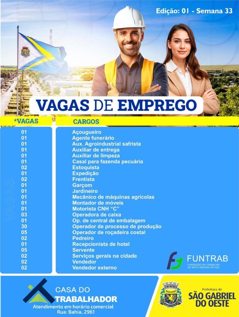 A Prefeitura Municipal de São Gabriel do Oeste, através da Casa do Trabalhador, está divulgando uma variedade de vagas de emprego. Essas oportunidades abrangem diferentes áreas e níveis de experiência, proporcionando uma série de opções para os interessados em ingressar ou retornar ao mercado de trabalho.
