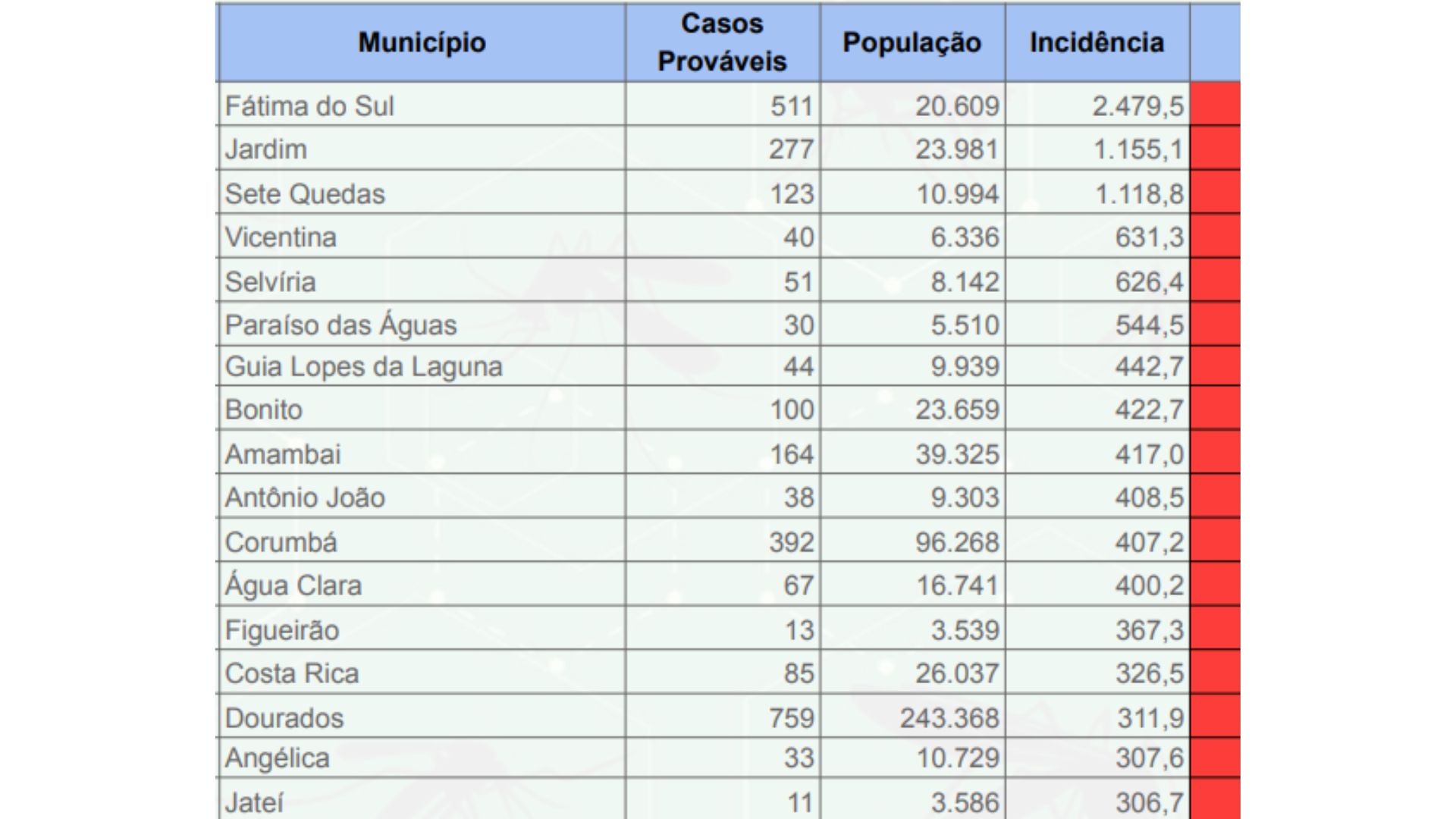Considerando todas as cidades de Mato Grosso do Sul, a incidência chega a 155,3 casos por 100 mil habitantes no Estado — 13,6 vezes maior que a média nacional, de 11,4. Nos últimos sete dias, a incidência estadual aumentou 17%.