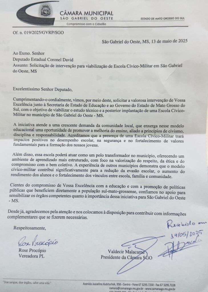 A Vereadora Rose Procópio (PL), em conjunto com o presidente da Câmara Municipal, Vereador Valdecir Malacarne (PP), protocolou no gabinete do Deputado Estadual Coronel David o Ofício n.º 019/2025, solicitando a implantação de uma Escola Cívico-Militar em São Gabriel do Oeste. A iniciativa surge em resposta à crescente demanda da comunidade local, que vê nesse modelo educacional uma oportunidade de elevar a qualidade do ensino, aliado a princípios fundamentais como civismo, disciplina e responsabilidade.