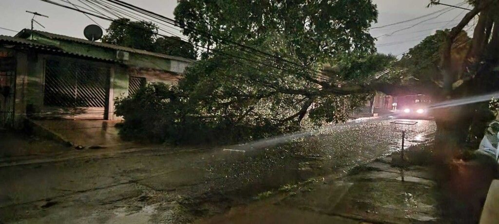 Chuva alagou trecho de via, derrubou árvore e fiação de energia elétrica e queda de granizo na noite desta segunda-feira (19), em Campo Grande. A chuva com ventania e raios marca mudança do tempo com chegada de frente fria.