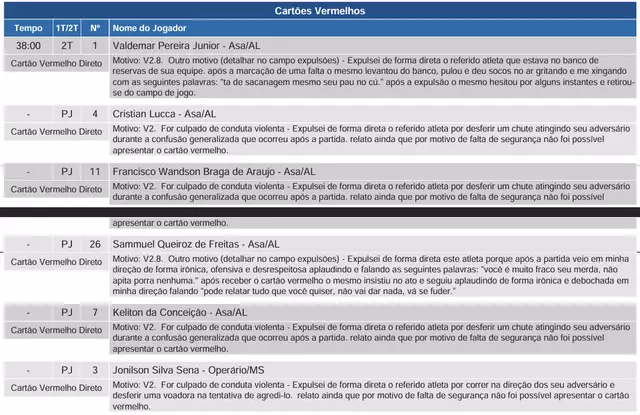 Do lado do Asa, quatro jogadores receberam cartão vermelho. O volante Valdemar Pereira Junior foi expulso por, conforme a súmula, ter saído do banco de reservas após o gol e desferido socos no ar, além de dirigir ofensas ao árbitro. Cristian Lucca, Francisco Wanderson Braga de Araújo e Keliton da Conceição foram expulsos por conduta violenta, após desferirem chutes contra adversários em meio à confusão.